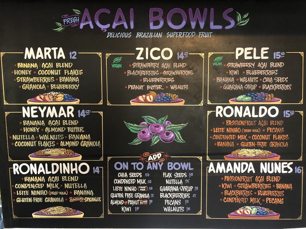 Served with a strawberry acai blend, kiwi, blueberries, bananas, walnuts, chia seeds and guarana syrup.
